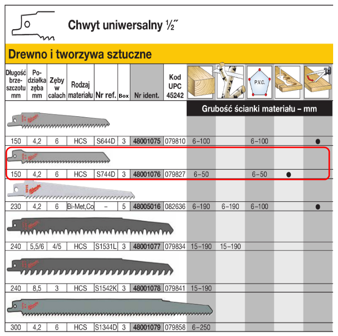 HCS : Stal węglowa. Brzeszczot używany głównie do cięcia drewna i tworzywa sztucznego.