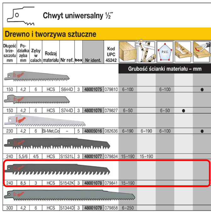 HCS : Stal węglowa. Brzeszczot używany głównie do cięcia drewna i tworzywa sztucznego.